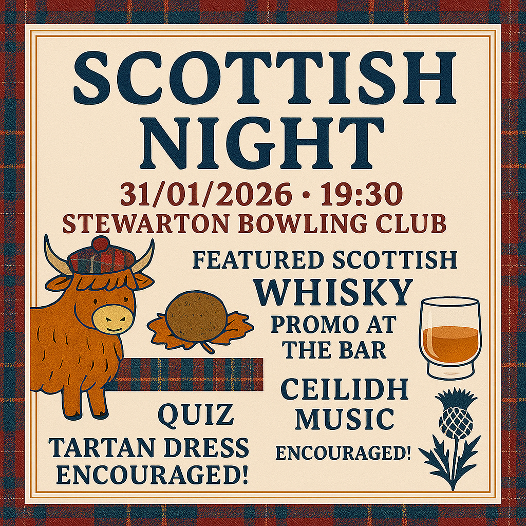 Join us for a lively evening of Scottish culture, music, and fun at Stewarton Bowling Club.